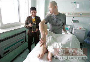 去年12月劉麗突然失明并昏迷,被送往醫(yī)院。今年9月23日她來北京做手術(shù)。原來體重126公斤的劉麗一下瘦了40斤,3個月沒下床了,小腿肌肉開始萎縮,膝關(guān)節(jié)顯得額外粗大。