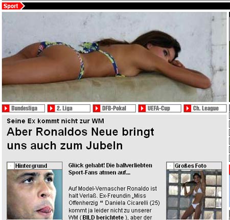 德國《圖片報》近來分析到,最近和羅納爾多打的火熱的巴西名模萊卡-奧利維拉很可能在明年隨同羅納爾多一起參加世界杯,并轉(zhuǎn)戰(zhàn)到德國的各個賽場。