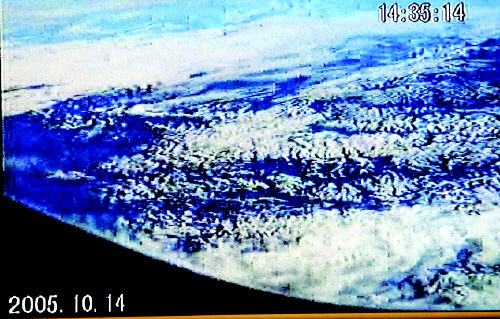 10月14日14時(shí)35分,神舟六號(hào)航天員傳回的畫面,畫面中展示的是從太空看到的中國(guó)大地