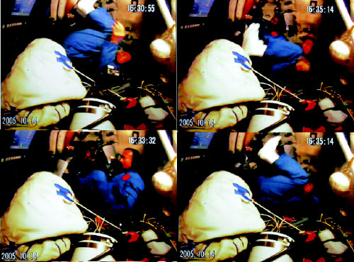 6點(diǎn)30分,北京飛控中心監(jiān)控屏幕上出現(xiàn)了精彩的一幕:費(fèi)俊龍半蹲在地上,用雙手撐住船艙地上的兩個(gè)固定物,然后突然向前,完成了一個(gè)前滾翻!