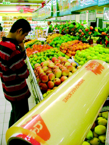 昨日,記者首先來到了我市某大超市,水果貨架上擺滿了用PVC保鮮膜包裝的水果。在包裝處,記者找到了大筒裝的保鮮膜,上面寫著一些日本文字說明,標(biāo)注的生產(chǎn)廠商是“三井化工株式會(huì)社”。記者詢問售貨人員是否知道PVC保鮮膜能致癌,對(duì)人體有害。女售貨員說:“一點(diǎn)沒害處,肉食柜臺(tái)也在用!惫,記者在肉食柜臺(tái)包裝處找到了寫著“石崎”字樣的日本產(chǎn)PVC保鮮膜。肉食柜臺(tái)的售貨員也說用PVC包裝沒有害處,“一直在用”。
