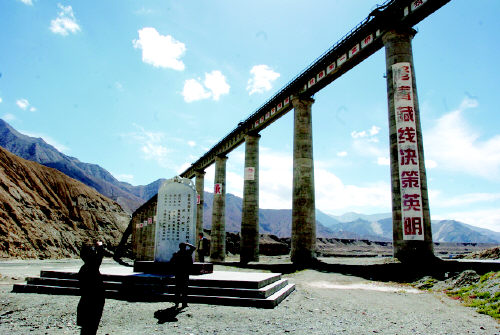 青藏鐵路的最高橋———三岔河特大橋,其最高橋墩為50多米(新華社發(fā)) |