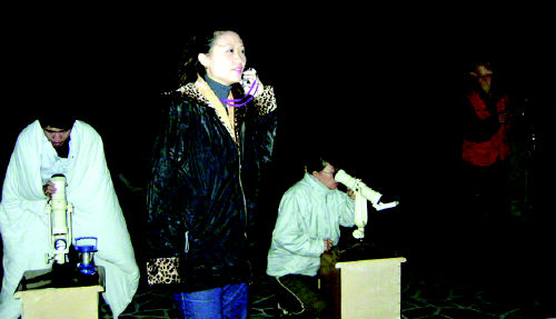 青島觀象臺工作人員和市天文愛好者協(xié)會會員在觀測“神六”軌跡(于小陽 攝) |