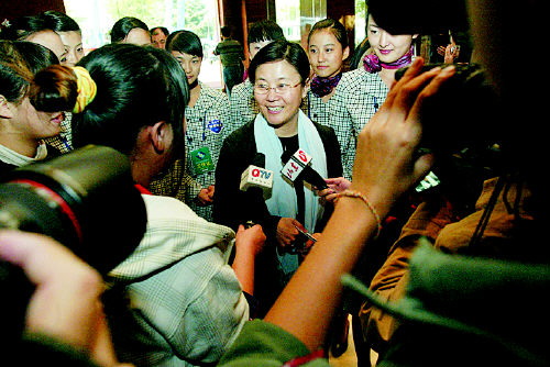 導(dǎo)演李少紅(中)剛一抵青就受到記者的追訪(徐崇德 攝) |