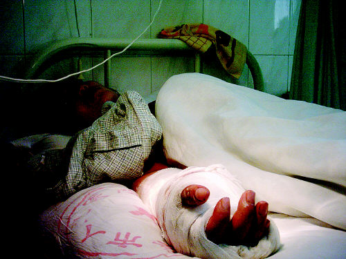 受傷女工躺在醫(yī)院病床上 |
