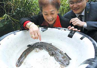 擔心娃娃魚餓著,宋女士還找來魚食喂,誰知它不理不睬,宋女士很著急。她馬上與記者聯(lián)系,希望為娃娃魚找個新家。記者趕到宋女士家看到,這條娃娃魚有70厘米長,身上還有不少泥漿,它睜著一雙小眼警惕地看著周圍的人,在它的身下,還有不少宋女士投放的魚食。