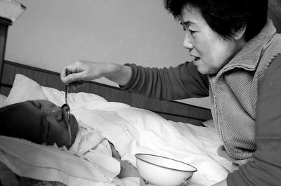 二十年過去了,七千多個(gè)日夜像流水一樣在赫清芳給丈夫四處求醫(yī)和喂飯的指縫間悄然流過,歲月爬滿了她的鬢角。天憐愛,地動(dòng)情,被醫(yī)生判了“死刑”的王茂連,近十年來(lái)一直靜靜躺在床上的植物人王茂連,如今,在赫清芳無(wú)微不至的照顧下,在赫清芳的愛和溫情的感召下,他的肢體已經(jīng)有了知覺,右手也能輕微活動(dòng),癱瘓初期必須使用胃管進(jìn)食的狀況也已經(jīng)徹底改變。而同樣讓赫清芳欣慰的是,兩個(gè)兒子都很爭(zhēng)氣,大兒子已成為某單位的業(yè)務(wù)骨干,小兒子也已在2003年考入英國(guó)一名牌大學(xué)攻讀碩士學(xué)位。
