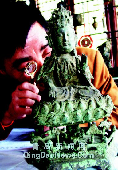 昨日,即墨市民袁女士帶著家中一尊銅觀音,來到天后宮請文物專家鑒定,F(xiàn)場專家鑒定發(fā)現(xiàn),這尊銅觀音竟然是明代的文物!據(jù)專家估算,