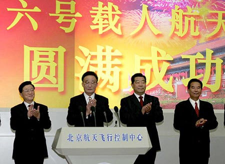 10月17日凌晨,神舟六號飛船成功返回地面。中共中央政治局常委吳邦國、賈慶林、黃菊、吳官正等在北京航天飛行控制中心觀看飛船返回實況。吳邦國宣讀中共中央、國務(wù)院、中央軍委賀電! ⌒氯A社記者劉衛(wèi)兵攝