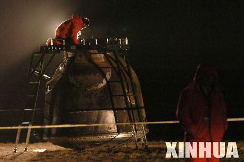 10月17日4時33分,神舟六號返回艙在內(nèi)蒙古四子王旗中部草原成功著陸,航天員費俊龍、聶海勝平安返回。新華社記者 王建民 攝