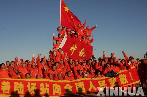 著陸場工作人員慶祝神六飛船返回艙成功著陸