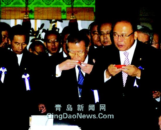 右圖:10月18日,在日本首都東京,自民黨干事長武部勤(右)和其他國會議員在參拜靖國神社時喝下米酒新華社/路透