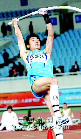昨天晚上將近10點(diǎn)鐘了,南京奧林匹克體育場(chǎng)里只余東南角的男子撐桿跳高還在繼續(xù)進(jìn)行比賽。而賽場(chǎng)上只剩下了一個(gè)高挑的身影,他就是593號(hào)山東青島選手劉飛亮(左圖)。他這個(gè)時(shí)候已經(jīng)獲得了金牌,正在向自己保持的5米70的全國(guó)記錄發(fā)起沖擊呢。結(jié)果三次試跳5米71都沒(méi)有成功。