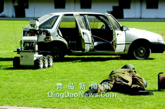 “現(xiàn)場發(fā)現(xiàn)可疑裝置,請立即處理!眱蓚特戰(zhàn)隊員帶領(lǐng)搜爆犬趕到現(xiàn)場,發(fā)現(xiàn)爆炸物品,并在現(xiàn)場安裝頻率干擾器,阻擋遙控信號。兩名身穿排爆服的排爆人員趕到現(xiàn)場。一名排爆人員用排爆桿夾起了可疑物品,把可疑物品放在排爆罐內(nèi)(右圖上)。另一名排爆人員遙控RMI-9WT型排爆機器人開向轎車(右圖下)。不到1分鐘,排爆機器人從車內(nèi)取出了爆炸物品,并把爆炸物品放到了安全地帶。機器人激光瞄準后,發(fā)射水炮槍,將爆炸物品摧毀。(陳勇