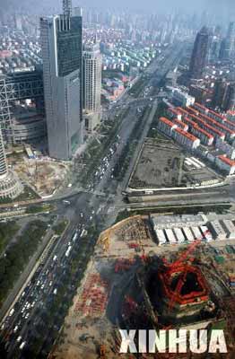 10月18日從空中俯瞰上海環(huán)球金融中心建筑工地,正在施工的建筑(右下角)已有6層樓高。