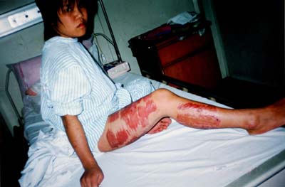 記者看到,羅的背部凹凸不平,有近十處植皮部位,特別刺眼!斑@些都是那些保安用電線打我、用火機(jī)把我燒傷后,傷口腐爛得厲害,植皮了還不平衡!绷_水秀說,由于新肉還沒有長出來,植皮部位很癢。