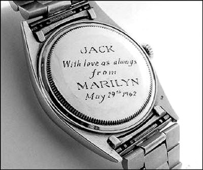 據(jù)悉,這塊秘密的“定情禮物”———勞力士金表是美國影星瑪麗蓮·夢露在1962年5月份肯尼迪總統(tǒng)45歲生日期間贈送給他的,肯尼迪出生于1917年5月29日,這塊勞力士金表顯然是夢露專門為肯尼迪定制的,表背上鐫刻著幾行字:“杰克:瑪麗蓮永遠愛你。1962年5月29日”。裝表的金盒上印著兩只鴿子親吻的圖像,盒中一張圓紙片上還寫著一首名為《在你生日之際,提出我真心的請求》的情詩,詩的結(jié)尾寫道:“讓我愛你,否則讓我去死!”