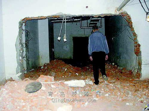 大圖:地下室承重墻被砸毀成洞。 |
