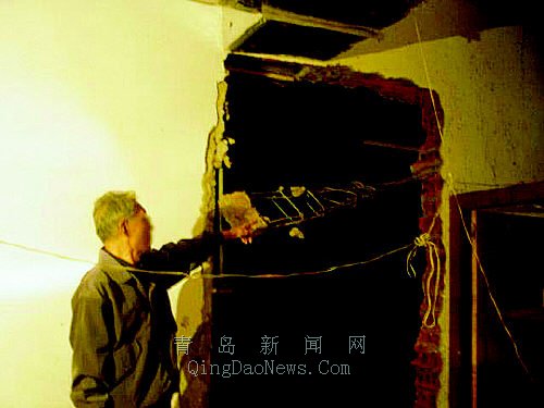 小圖:被砸墻體露出鋼筋。 |