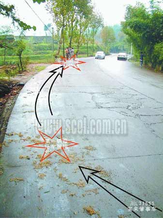 “我和陳曉斌都是樂山匯運駕校的教練,17日中午,我們按教學計劃,由陳曉斌騎一輛‘太子125’型摩托車到犍為縣定文鎮(zhèn)招收學員。當駛出犍為縣城約4公里,路經(jīng)‘伏兒溝’路段左轉(zhuǎn)彎上坡時,一輛銀白色、車牌號為‘川L77555’的寶來轎車為超越前面一輛貨車從坡上沖了下來,將我們前面行駛的一輛車牌號為‘川LN3119’的‘五羊125’撞翻,摩托車駕駛員被撞飛到路邊的排水溝里!币驗樾貝灒疚湔f話顯得有些吃力,“見此情形,陳曉斌立刻將摩托車靠邊停下。但寶來車將‘五羊125’撞翻后并未停下,徑直向我們沖過來。‘砰’的一聲巨響!還沒來得及反應(yīng),我就被撞飛到路邊的草坡上。我忍痛坐了起來,看到陳曉斌已經(jīng)被撞飛到草坡下一個離公路約2米高、4米遠的深坑里,無法動彈。這時,白色寶來也停下了,駕駛員下車看了看被撞傷的3個人,就開始打電話,我沒聽清楚他說什么!