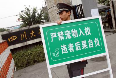 昨(20)日,川大推行“禁狗令”,嚴(yán)禁將狗帶入學(xué)校辦公教學(xué)區(qū)、學(xué)生區(qū)和公共區(qū)。該校有關(guān)人士表示,這樣做是為凈化校園,畢竟校園不是公園。