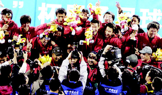 10月21日,山東隊(duì)隊(duì)員在領(lǐng)獎(jiǎng)臺(tái)上慶祝。當(dāng)日,在南京進(jìn)行的十運(yùn)會(huì)男子足球決賽中,山東隊(duì)以1比0戰(zhàn)勝上海隊(duì),奪得冠軍,上海隊(duì)和遼寧隊(duì)分獲亞軍和 季軍。(新華社數(shù)碼傳真)