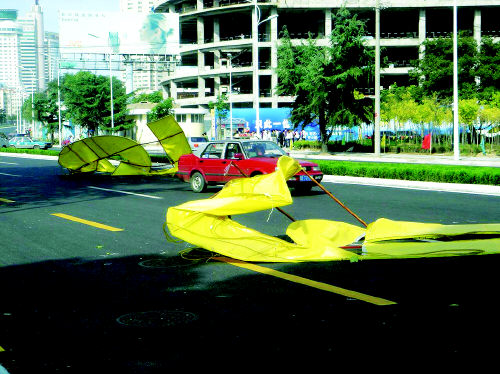 據(jù)一位目擊者介紹,這些鐵質(zhì)廣告牌是從正在建設(shè)中的高達(dá)20多層的國(guó)華大廈落下的,是大廈的“售樓熱線”數(shù)字,每個(gè)數(shù)字都有10多斤重。楊海濤攝影報(bào)道 |