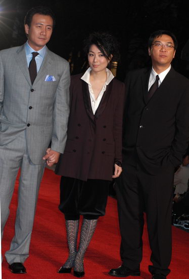 張藝謀和高倉健走紅地毯 胡軍、鄭秀文、導(dǎo)演關(guān)錦鵬(左起) 2005年10月22日晚,亞洲規(guī)模最大,最有影響的國際電影節(jié)----第18屆東京國際電影節(jié)在東京六本木新城開幕。 開幕式前,眾多明星亮相紅毯,其中有《長恨歌》導(dǎo)演演員關(guān)錦鵬、鄭秀文、胡軍,中國導(dǎo)演、本屆電影節(jié)評審團(tuán)主席張藝謀,參賽片《泥鰍也是魚》的導(dǎo)演楊亞洲。
