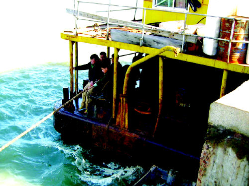 昨日上午,黃島電廠碼頭附近海域風起浪涌,最高風力達到六七級,一艘停泊在附近漁港碼頭的施工船突然錨繩斷裂,隨風漂移出近200米后撞上電廠碼頭,船上的起重裝置和部分鋼管順勢卡在碼頭堤沿上,船只擱淺不能動彈。一旦潮落,遇險船只隨時可能發(fā)生側(cè)翻危險。