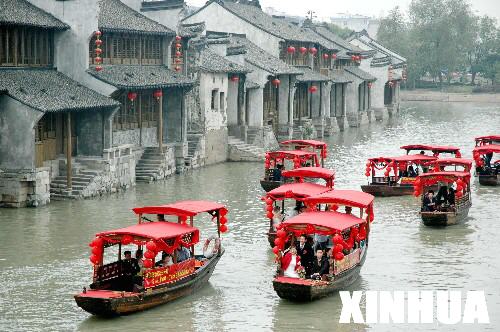 10月22日,新人們乘坐彩船在河上暢游。當(dāng)日,浙江省嘉興市舉行第四屆江南水鄉(xiāng)集體婚禮,70名新人同時(shí)邁入婚姻殿堂。