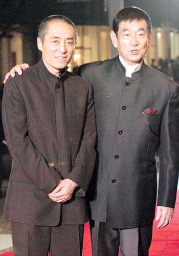 中國(guó)導(dǎo)演張藝謀(左)與日本著名演員高倉(cāng)健出席開幕式
