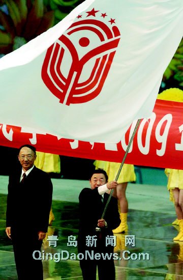 左圖:10月23日,第十一屆全國運動會承辦地代表、山東省省長韓寓群在閉幕式上揮舞