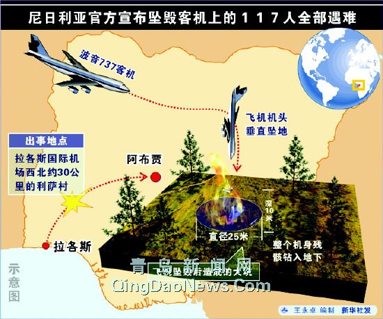 扭曲的金屬,破損的行李,殘缺的肢體。在經(jīng)歷了一系列混亂與謠言之后,尼日利亞貝爾菲尤航空公司一架失事波音737客機(jī)的殘骸23日終于被找到。當(dāng)局說,從現(xiàn)場情況看,機(jī)上的117人已經(jīng)全部遇難。    現(xiàn)場沒有發(fā)現(xiàn)任何幸存者