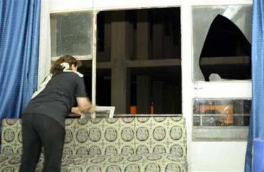 24日,在爆炸酒店附近,一位婦女在清理自家起居室震碎的玻璃。