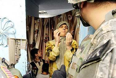 24日,一名伊拉克婦女正在接受士兵的詢問。