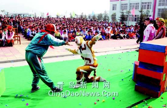 昨天上午,“情系山區(qū)·放飛希望”流動舞臺進(jìn)校園公益演出活動在嶗山區(qū)王哥莊街道曉望小學(xué)啟動。從昨天起至10月29日,話劇院將在嶗山區(qū)30余所中小學(xué)校巡回演出,為兩 萬余名中小學(xué)生送上一臺文化大餐。    上圖:青島市話劇團(tuán)的演員曉望小學(xué)學(xué)生演出兒童劇《陳小虎》。記者張毅民通訊員李慧攝