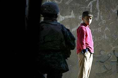 一個伊拉克男孩冷漠的注視著一名正在站崗的駐伊美軍士兵