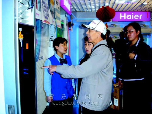 北京消費(fèi)者正向直銷員咨詢購(gòu)買海爾三超直流雙新風(fēng)空調(diào)