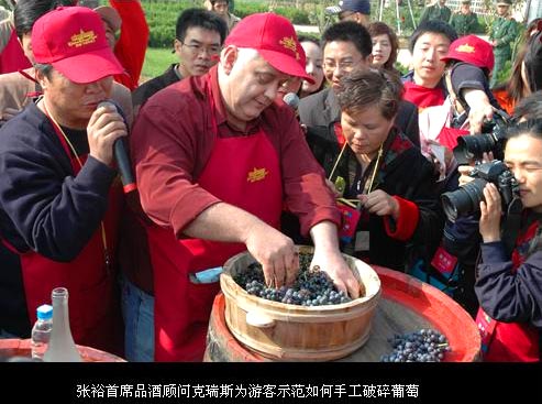 “采摘葡萄”看似簡單,其實是釀酒前的重要準(zhǔn)備環(huán)節(jié)。張裕?卡斯特酒莊首席品酒顧問克瑞斯親自為游客示范如何采摘。這位可愛的澳大利亞紳士來自澳大利亞的“葡萄酒之鄉(xiāng)”——阿德萊德,在葡萄酒釀造、鑒賞方面具有專業(yè)造詣,在整個活動中以其深入淺出的風(fēng)趣語言為游客介紹葡萄酒的專業(yè)知識。