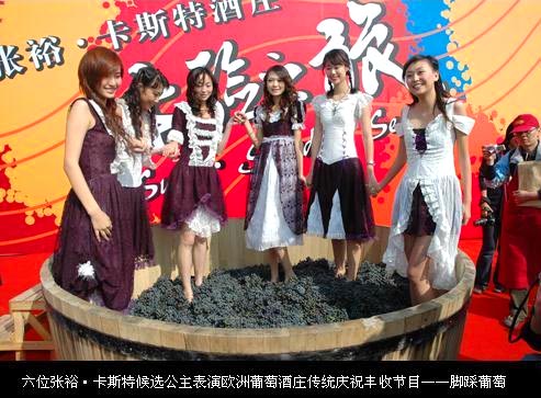 張裕?卡斯特酒莊的慶;顒觿t是請六位“候選公主”腳踩葡萄并進行搶答比賽,由游客根據(jù)她們的美妙嬌姿及才情表現(xiàn)來評選出張裕?卡斯特公主的稱號誰屬。一個直徑2.5米、高1米的大木盆擺放在廣場的舞臺上,里面盛滿新鮮采摘的葡萄。準(zhǔn)備就緒的六位候選公主身著華麗的宮廷短裙款款出場,步入大木盆中。歡快悠揚的歐洲弦樂背景音樂響起,“公主”們隨著快樂的音符優(yōu)雅地腳踏葡萄,盈盈笑意伴著飛濺的葡萄汁,與臺下游客的熱烈反應(yīng)融為一體,盡情展現(xiàn)歐洲最古老的葡萄榨汁藝術(shù),將現(xiàn)場活動推向了高潮。