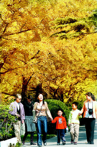 幾位市民在中山公園金黃色的銀杏樹下游覽。時下,島城的樹葉開始變色,色彩斑斕、層林盡染的樹木,給秋天的島城披上迷人的色彩。李學(xué)亮攝
