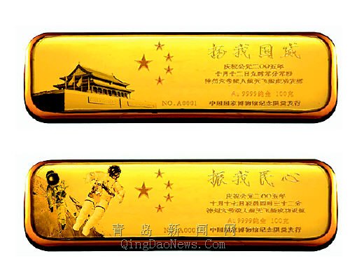 日前,國家博物館宣布,為慶祝神舟六號飛船成功升空及凱旋歸來,國博決定發(fā)行1000套神舟六號紀(jì)念金條。    每套紀(jì)念金條由兩根各為100克的金條 組成,其售價(jià)為3.2萬元。邵燕輝攝