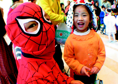 記者趙健鵬攝影報道 昨日上午,香港中路一家百貨店門前出現(xiàn)近200名裝扮成“蜘蛛俠”、“蝙蝠俠”、“巫師”、“ 精靈”等模樣的小朋友,大家在音樂聲中翩翩起舞,按照各自扮演的角色擺出各種動作。他們在幼兒園老師的帶領(lǐng)下,在店里尋找藏在角落里的萬圣節(jié)禮物。