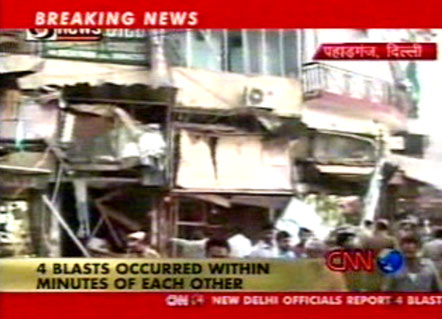 第一次爆炸是當(dāng)?shù)貢r(shí)間17:30(北京時(shí)間20:00)左右發(fā)生于帕哈拉甘(Paharganj)地區(qū)靠近火車站的熱鬧集市里,市場(chǎng)里擠滿了為印度教傳統(tǒng)節(jié)日購物的人群。帕哈拉甘(Paharganj)地區(qū)是一個(gè)批發(fā)市場(chǎng),有許多便宜的小旅館,外國背包旅行者經(jīng)常光顧此地。當(dāng)局已經(jīng)封鎖了通往爆炸現(xiàn)場(chǎng)的道路。