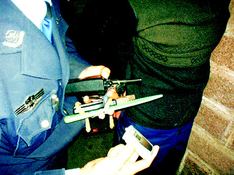 嫌疑人身上的匕首、改錐和一部無(wú)法說(shuō)明來(lái)源的手機(jī)。海濤攝 |