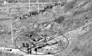 四川臥鋪客車翻在山腳下面目全非(圈內(nèi)所示),共造成12人死亡,出事車輛系超載行駛。