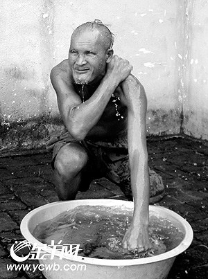 上月27日下午2時,記者來到陽東縣新洲鎮(zhèn)烏石村采訪這位怪人。只見他腳部微瘸,吐字含混,上身裸露,皮膚光滑異常。記者問:“今天你泡水了嗎?”他答,從早上起床至現(xiàn)在,已經(jīng)澆水3次。說著又在門口的一個整日供其專用的大水盆里掬水往身上澆,弄得全身濕透,不一會,又干了。