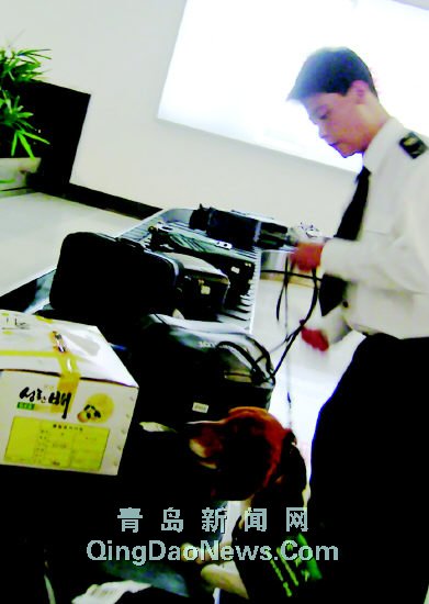 人員上前開箱檢查。記者昨日從青島檢驗檢疫局了解到,自10月1日起在青島機場上崗的兩只檢疫犬,作為阻擊禽流感的“戰(zhàn)士”也沖上了一線(圖)。