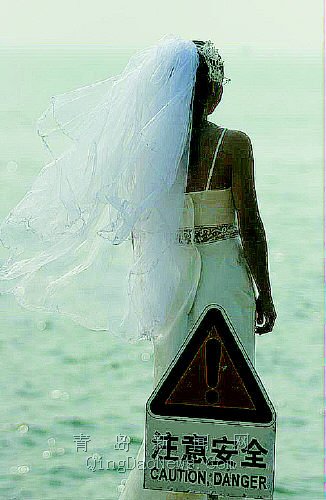 右圖:海邊拍攝婚紗照的個別新人只顧美景而忽略安全,在小青島的岸礁邊一位忘情的新娘越過安全警示標(biāo)志。臧磊攝