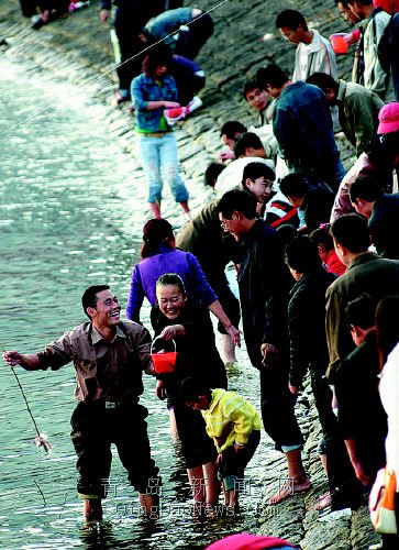 右圖:海邊拍攝婚紗照的個別新人只顧美景而忽略安全,在小青島的岸礁邊一位忘情的新娘越過安全警示標(biāo)志。臧磊攝    上圖:昨天下午,音樂廣場防浪堤上近百名游客不顧石滑和深秋水涼,挽起褲腿釣蟹取樂。提醒游客注意安全,小心著涼感冒。徐常青攝    右圖:海邊拍攝婚紗照的個別新人只顧美景而忽略安全,在小青島的岸礁邊一位忘情的新娘越過安全警示標(biāo)志。臧磊攝